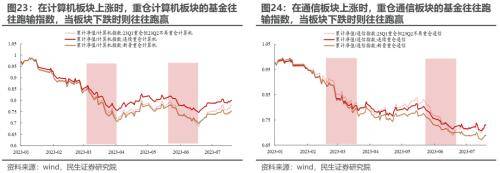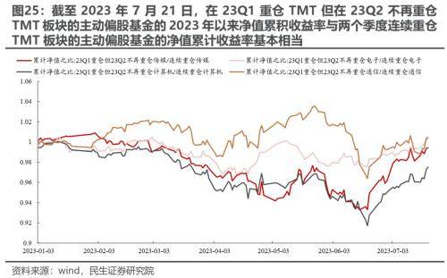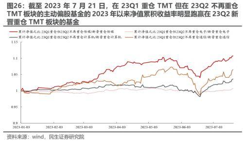 基于我们在报告《机构配置的“出埃及记”》的测算,2023Q1主动偏股基金大幅增仓TMT却净值表现不佳背后在于增仓的时点可能更多在加速上行之后(3月中下旬)。对于2023Q2而言,一方面,当TMT板块上涨时,重仓TMT板块的基金往往并不能跑赢相应的指数,这意味着TMT上涨时对于重仓TMT板块的基金净值会有拉动作用;另一方面,基于我们的测算发现,在2023Q1重仓TMT但在2023Q2不再重仓的主动偏股基金,今年以来的累计回报与连续重仓TMT板块的主动偏股基金收益率相差不大(略低),特别是在面临回撤之时明显跑赢两个季度连续重仓TMT板块的基金,同时,上述基金今年的累计回报高于在2023Q2新晋重仓TMT板块的基金的今年累积回报。这意味着面对当下的TMT行情,即使指数明显上涨也可能出现净值收益率表现不佳的情况,这或许源于2019年以来赛道投资的方式在TMT投资上显得有点水土不服,因而投资者忽视了当下行情参与的位置与时机的重要性。这也解释了我们前面观测到的规模偏小的基金由于其调仓的灵活性有更高概率业绩表现突出的现象。
