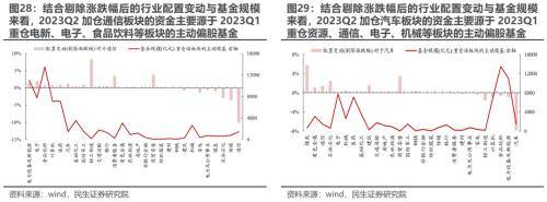 (2)重仓电新、食品饮料、医药等板块的主动偏股基金业绩靠后,且除医药外,有大量的基金不再选择重仓上述板块;负债端方面,重仓上述三种板块的基金均遭受了明显的赎回。如果我们更进一步地从2023Q1重仓上述板块的基金的配置变动来看:2023Q2主动偏股基金加仓较多的板块大多源于在2023Q1重仓上述板块的基金的切换。