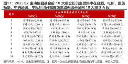 从风格上看,2023Q2主动偏股基金主要加仓大盘/中盘成长板块。对于行业而言,结合超配比例的变动、相对/绝对配置变动来看,2023Q2主动偏股基金主要选择加仓通信、汽车、家电、电子、电力及公用事业、机械、军工等板块,主要减仓食品饮料、交运、计算机、电新、消费者服务、石油石化等板块,其中,加仓较多的通信、汽车、家电等板块均从低配行业变为超配行业。从行业内部持股集中度来看,2023Q2主动偏股基金在部分加仓较多的行业中的持股集中度(CR5)上升,而减仓较多的板块的持股集中度(CR5)更倾向于下降。值得一提的是,2023Q2主动偏股基金前10大重仓股仍主要集中在白酒、电新、医药板块,中兴通讯、中际旭创开始成为主动偏股基金前10大重仓A股。