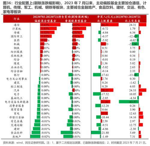 2023 年 7 月以来,主动偏股基金依然延续了从“茅宁”向其他板块切换的趋势。基于二次规划法, 2023Q2 以来 ( 截至 7 月 21 日 ) ,主动偏股基金的仓位逐步震荡回升,在行业配置上 ( 剔除涨跌幅 ) ,主动偏股基金主要加仓通信、计算机、传媒、军工、机械、钢铁等板块,主要减仓金融地产、食品饮料、建材、交运、有色、家电等板块。 相应地,北上配置型资金则主要净买入新能源产业链、通信、家电、机械等板块,并卖出食品饮料、金融地产以及除通信外的 TMT 板块 。 这意味着公募与北上资金在通信、机械上的配置有所共振,而在TMT以及电新等板块上的分歧依然明显。
