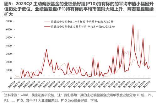 2 023Q2 主动偏股基金的业绩最好组 (P10) 持有标的的平均市值略有回升但仍处于相对低位,业绩最差组 (P1) 持有标的平均市值则大幅上升,两者差距继续扩大。 这意味着整体而言,业绩居前的主动偏股基金仍持有规模相对较小的标的,中小市值风格再度占优。从转移概率视角来看,相较于2023Q1,2023Q2主动偏股基金的业绩继续呈现了“自我强化”的特征,即2023Q1业绩占优的主动偏股基金在2023Q2仍有较大的概率继续占优,而2023Q1业绩较差的基金则同样有较大的概率延续表现不佳。此外,业绩最好组 (P10) 基金的平均规模环比继续回落,业绩最差组 (P1) 基金平均规模环比继续上升,即中小规模的基金整体业绩仍呈现了一定的优势。