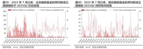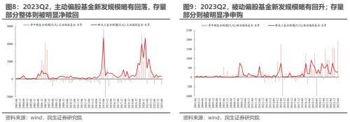 2023Q2权益类基金(主动+被动)的增量资金规模(新发+净申购)有所回升,且主要源于被动偏股型基金,主动权益基金与被动权益基金分化明显。具体而言:1)对于主动偏股基金,2023Q2其新成立规模相较于2023Q1略有回落,且存量部分整体被明显净赎回,整体而言,主动偏股基金的增量资金规模(新发+净申购)明显回落(从2022Q4的+601.02亿元回落转负至2023Q2的-590.58亿元);2)对于被动偏股基金,2023Q2其新成立规模环比上升且存量部分被明显净申购,整体来看,其负债端从2023Q1的+190.85亿元提升至2023Q2的+2213.04亿元。