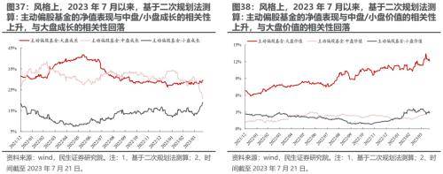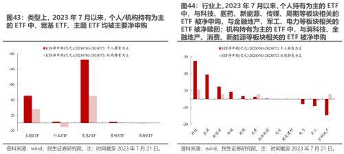 负债端层面,如果我们以个人持有为主的ETF作为基民申赎的高频代理变量发现:2023年7月以来,个人持有为主的ETF中,行业上,与科技、医药、新能源、传媒、周期等板块相关的ETF被净申购,与金融地产、军工、电力等板块相关的ETF被净赎回。同时,2023年7月以来(截至7月21日),主动/被动偏股基金发行情况相较于2023Q2均有所回落。考虑到当前主动偏股基金的仓位虽然有所回落,但仍处于历史相对高位,同时负债端层面可能发生的资金从主动权益流向被动权益的情况,同样可能对于主动权益基金而言是一个考验。
