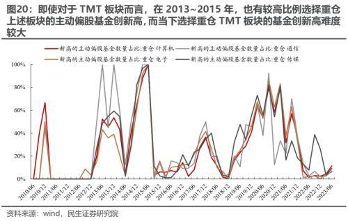 值得一提的是,从历史上看,当板块成为市场主线时,重仓该板块的基金往往会有较高比例能够创净值新高,即使对于TMT板块自身而言也是如此(2013~2015年)。对于本轮而言,如果市场认为TMT是当前市场的主线,但重仓TMT板块的基金在当下却难以实现净值新高,这与过往有很大不同。