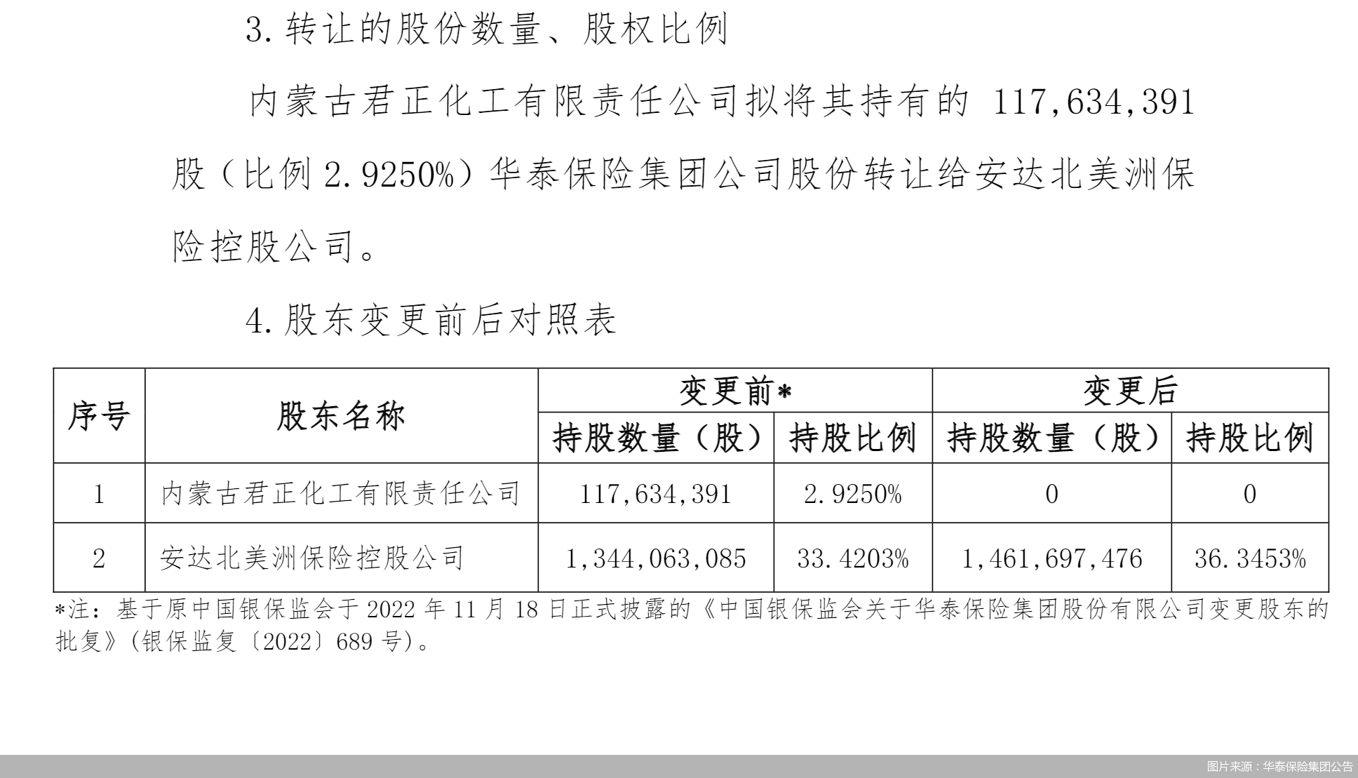 本次股权转让完成后,安达北美洲保险持有华泰保险集团36.3453%股份;君正化工不再持有华泰保险集团股份。上述股权变更事宜尚需国家金融监督管理总局核准。