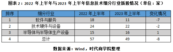 综上,今年上半年,A股总体新股数量同比增加2家,但信息技术行业新股数量却同比减少,且软件与服务行业、技术硬件与设备行业的新股数量减少明显。