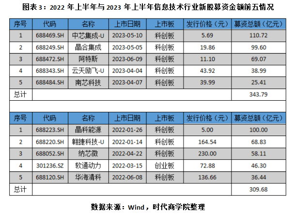 Wind数据显示,从募资情况看,2023年上半年,信息技术行业新上市企业的募资总额为776.14亿元,较去年上半年的1016.92亿元同比减少23.68%;平均募资额为15.84亿元,较去年上半年的17.84亿元同比减少11.21%。