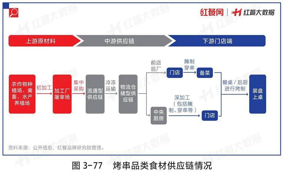具体来看,作为烧烤的最大细分赛道,烤串品类的连锁化和规模化程度相对低,至今没有一个品牌突破千家门店。烤串品牌的规模化程度相对低,这与烤串供应链标准化难度大、第三方供应链企业参与程度低存在一定的关系。