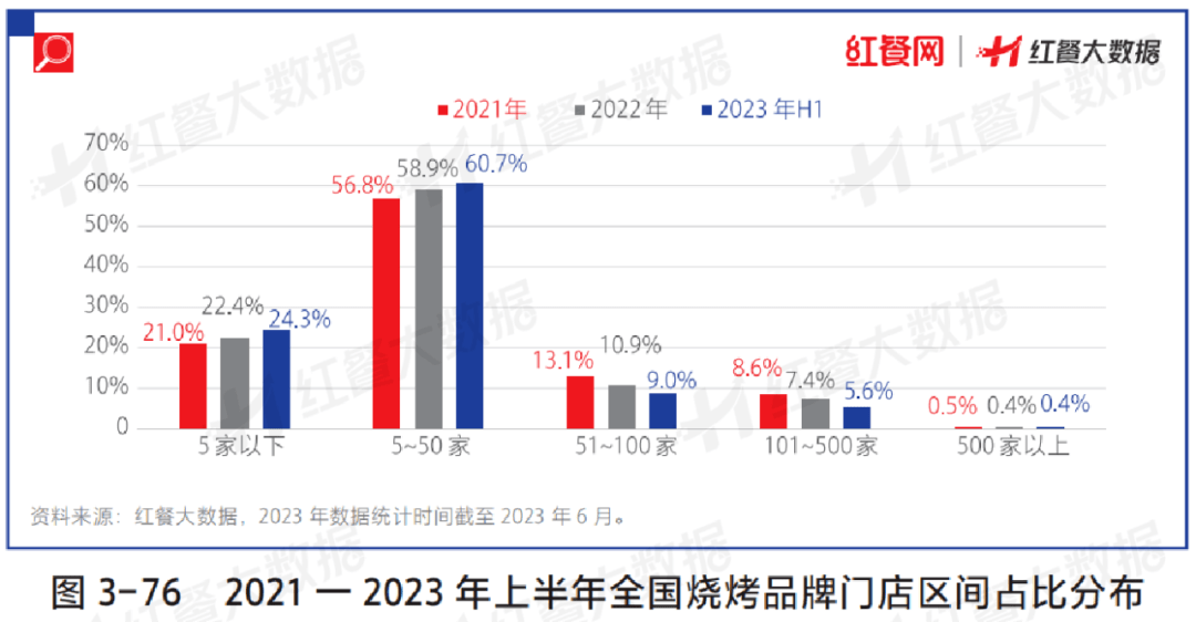 据红餐大数据,截至2023年6月,门店数在5家以下的烧烤品牌占据了24.3%,门店数在5~50家的品牌数占比最高,达到了60.7%,而门店数在50家以上的品牌占比仅有15.0%。从近两年半的烧烤品牌门店区间占比分布来看,小型连锁品牌依然是烧烤赛道的主流玩家,中大型的连锁品牌较少。