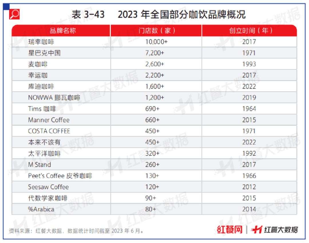 具体来看,国内门店数最多的咖饮品牌是瑞幸咖啡。瑞幸咖啡差异化地瞄准了消费者对于便捷、高性价比的消费需求,通过“小店模式”快速铺设大量门店。据红餐大数据,截至2023年6月,瑞幸咖啡的门店数超过10,000家,进驻城市超过240个,已经远超星巴克在国内的总门店数。