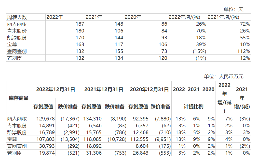 “同行业公司也面临着相同的问题。”为表明存货周转变慢、跌价准备计提比例提高是行业普遍现象,在回函中专门列举了同行公司的库存情况。不过钛媒体App注意到,2022年无论是在存货周转天数还是存货原值上都高出同行公司。