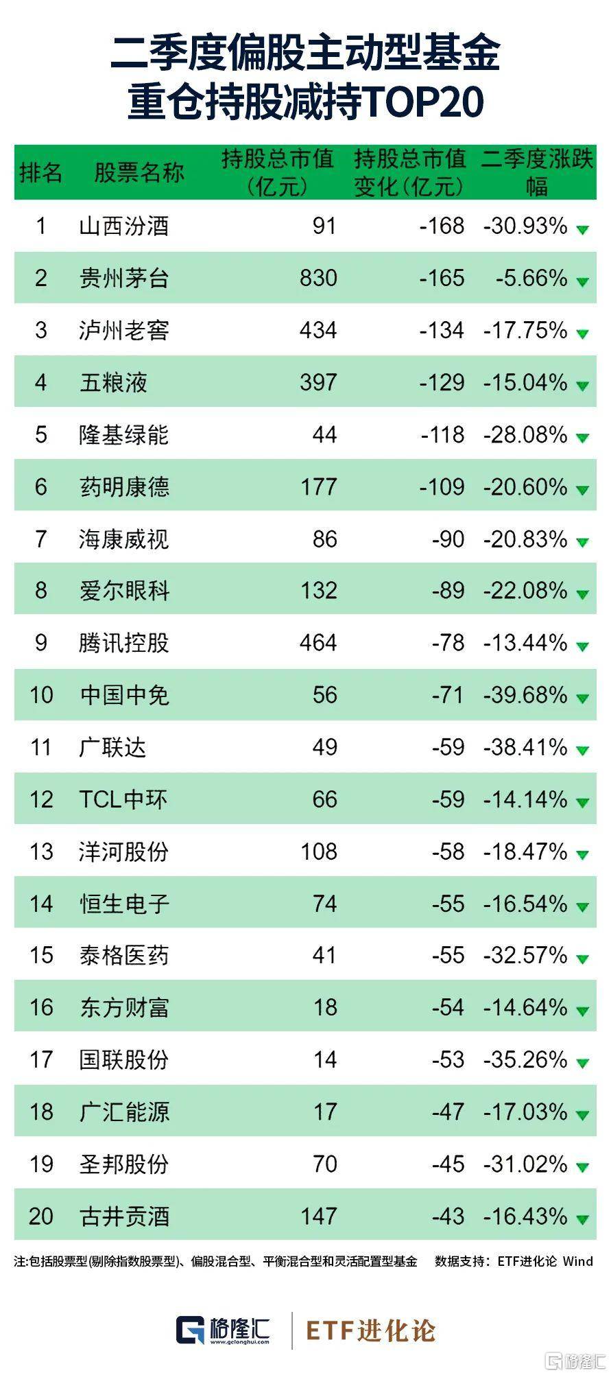 从减持情况看,截至二季度末,山西汾酒、贵州茅台、隆基绿能、五粮液被减持市值均超100亿元,其中,山西汾酒被减持市值接近150亿元。泸州老窖、药明康德、爱尔眼科、海康威视、腾讯控股被减持市值均超80亿元。