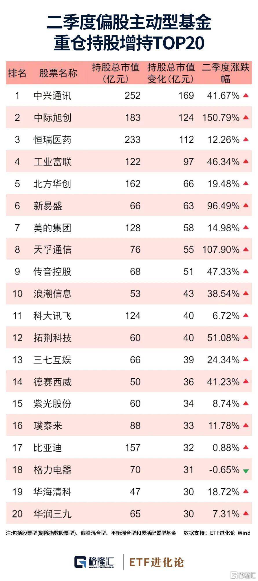 从增持情况看,中兴通讯获增持最多,截至二季度末,积极投资偏股型基金合计增持中兴通讯174.68亿元,增持中际旭创、恒瑞医药市值均超过100亿元,工业富联获增持市值达95.14亿元,北方华创、新易盛均获增持超60亿元。