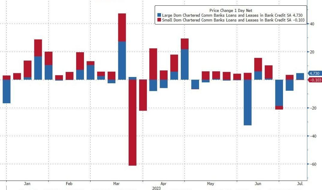 但在贷款端情况更为复杂。当周,小型银行的贷款额小幅缩减了103亿美元,而大型银行的贷款额增加了47亿美元。