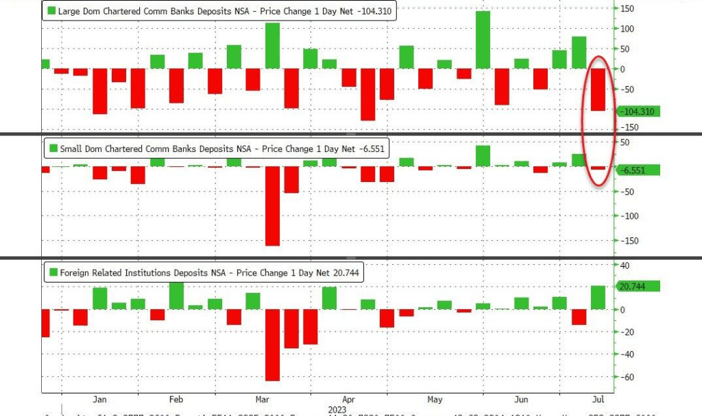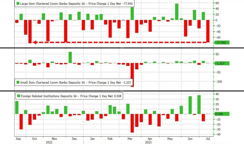 未经季节调整,大型银行当周存款流出超过1000亿美元,小型银行存款损失65亿美元。