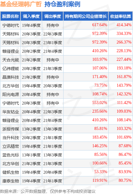 韩广哲管理的金鹰改革红利混合基金在19年4季度买入宁德时代,已连续持有3年又2个季度。持有期间的估算收益率为414.34%,持有期间宁德时代在2019年到2022年的年报营业总收入增幅达617.64%。