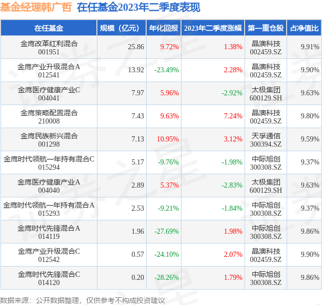 截止2023年二季度末,基金经理韩广哲旗下共管理11只基金,本季度表现最佳的为金鹰策略配置混合(210008),季度净值涨7.24%。