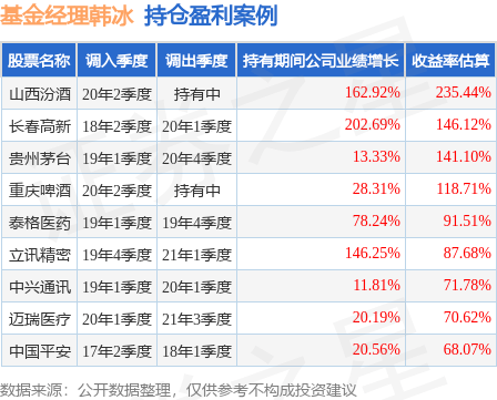 韩冰管理的招商中小盘混合基金在20年2季度买入山西汾酒,已连续持有3年又0个季度。持有期间的估算收益率为235.44%,持有期间山西汾酒在2020年到2022年的年报归属净利润增幅达162.92%。