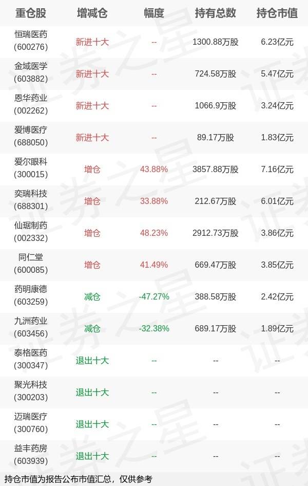 7月21日汇添富基金旗下郑磊管理的汇添富创新医药主题混合型基金公布中报,近1年净值增长率-24.33%。与上一季度相比,该基金前十大重仓股新增恒瑞医药,金域医学,恩华药业,爱博医疗;并对爱尔眼科增仓1176.59万股,为该基金第一大重仓股;泰格医药,聚光科技,迈瑞医疗,益丰药房等退出前十大重仓股;详细数据如下: