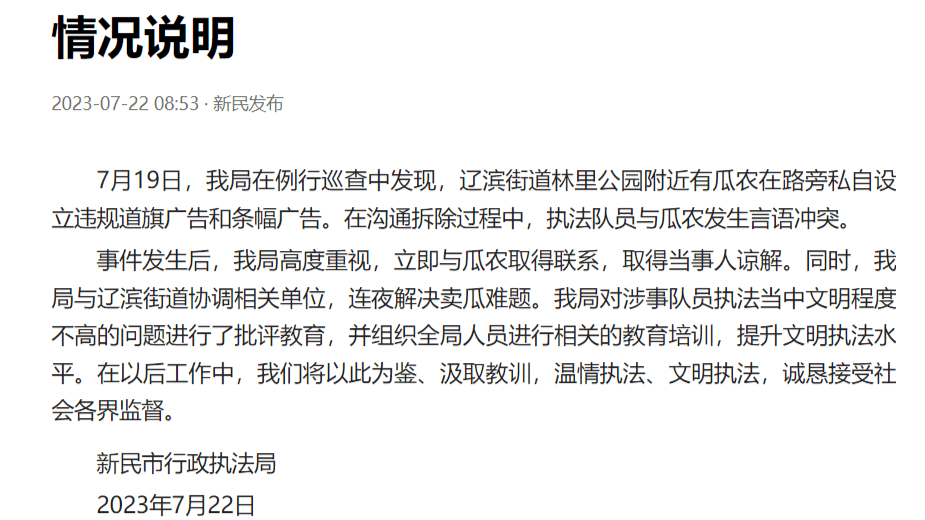 事件发生后,我局高度重视,立即与瓜农取得联系,取得当事人谅解。同时,我局与辽滨街道协调相关单位,连夜解决卖瓜难题。我局对涉事队员执法当中文明程度不高的问题进行了批评教育,并组织全局人员进行相关的教育培训,提升文明执法水平。在以后工作中,我们将以此为鉴、汲取教训,温情执法、文明执法,诚恳接受社会各界监督。