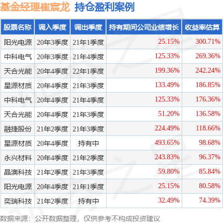 崔宸龙管理的前海开源公用事业股票基金在20年3季度买入阳光电源,在持有2个季度后在21年1季度卖出。持有期间的估算收益率为300.71%,持有期间阳光电源在2020年到2021年的年报营业总收入增幅达25.15%。