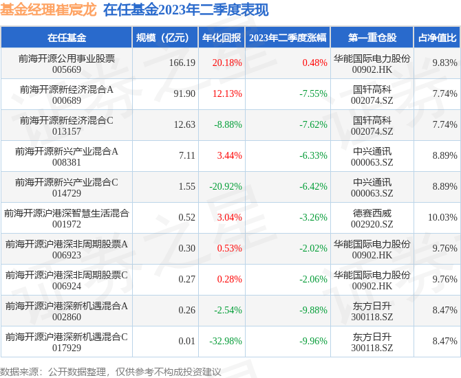 截止2023年二季度末,基金经理崔宸龙旗下共管理10只基金,本季度表现最佳的为前海开源公用事业股票(005669),季度净值涨0.48%。