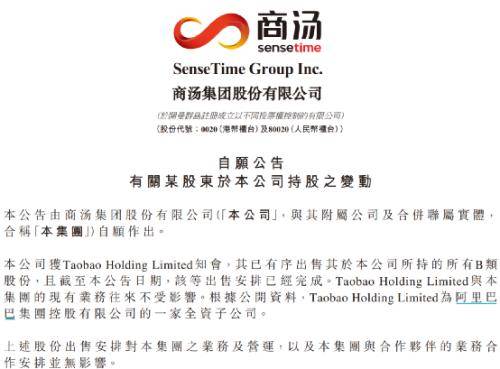 7月21日,商汤-W发布股东持股变动的公告称,收到阿里巴巴集团的全资子公司Taobao Holding Limited通知,其已经有序出售所持有的商汤的所有B类股份。Taobao Holding Limited与商汤集团的现有业务往来不受影响。