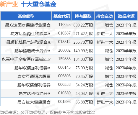 根据2023半年报公募基金重仓股数据,重仓该股的公募基金共24家,其中持有数量最多的公募基金为易方达医疗保健行业混合。易方达医疗保健行业混合目前规模为60.39亿元,最新净值3.17(7月20日),较上一交易日下跌0.75%,近一年上涨6.09%。该公募基金现任基金经理为杨桢霄。杨桢霄在任的基金产品包括:易方达大健康混合,管理时间为2017年9月27日至今,期间收益率为74.4%;易方达全球医药行业(QDII)人民币,管理时间为2020年1月20日至今,期间收益率为-14.42%;易方达医药生物股票A,管理时间为2020年11月4日至今,期间收益率为-38.53%。