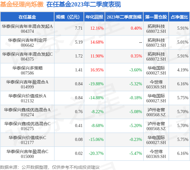 截止2023年二季度末,基金经理尚烁徽旗下共管理10只基金,本季度表现最佳的为华泰保兴吉年丰混合发起A(004374),季度净值涨0.4%。