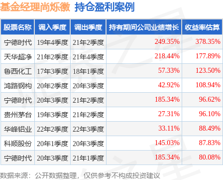 尚烁徽管理的华泰保兴吉年丰混合发起A基金在19年4季度买入宁德时代,在持有1年又2个季度后在21年2季度卖出。持有期间的估算收益率为378.35%,持有期间宁德时代在2019年到2021年的年报归属净利润增幅达249.35%。