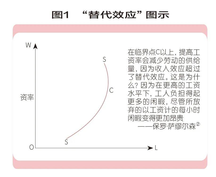 当工资增加,意味着收入增加,这就使得你会想购买更多的商品、服务,此外还想有更多的闲暇时间,于是利用各种机会或理由减少劳动付出,这就是“收入效应”引发的劳动供给反向下降的现实(图1)。