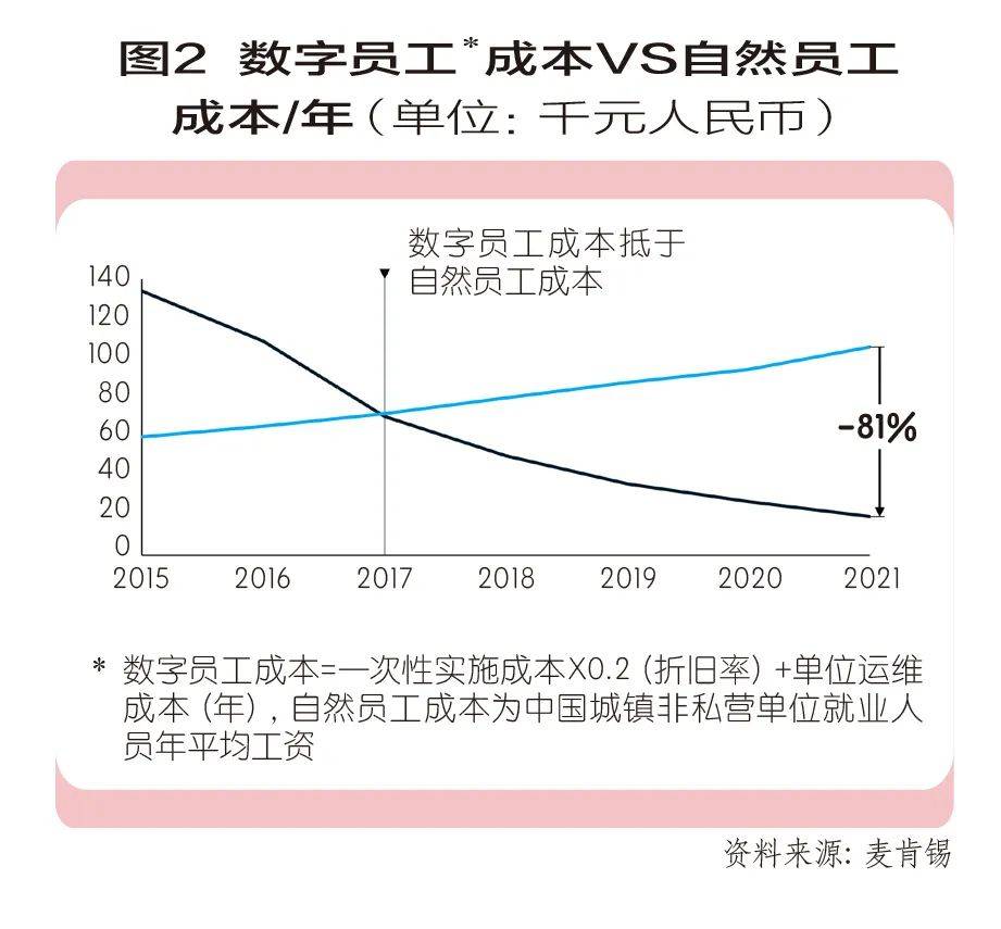 关于使用“数字化劳动力”如何节约用工成本,麦肯锡做过数据统计。截止2021年,使用“数字化劳动力”的企业每年人工成本降低81%(图2)。