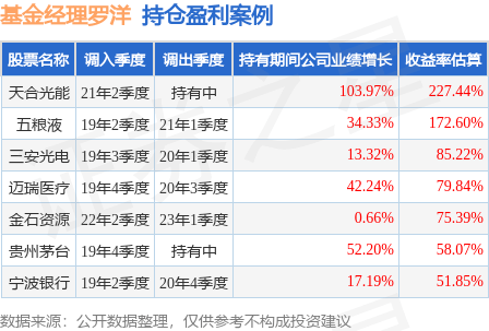 罗洋管理的广发策略优选混合基金在21年2季度买入天合光能,已连续持有2年又0个季度。持有期间的估算收益率为227.44%,持有期间天合光能在2021年到2022年的年报归属净利润增幅达103.97%。