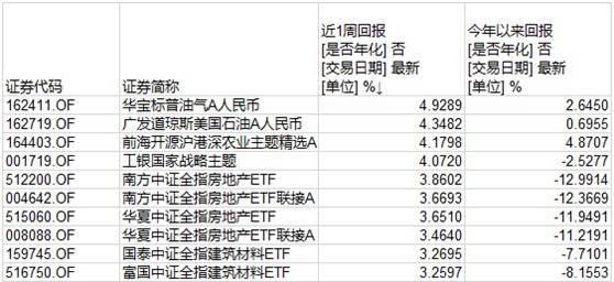 领涨方面,TOP10中除了两只跟A股关系不大的石油主题LOF,排第3的是一只农业主题基金;随后的工银国家战略主题和6只ETF,都是房地产相关,但它们年内收益都还是负的。