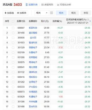 反映到个股上,3403只个股本周累计下跌,跌幅超过20%的有17只。