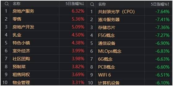 板块方面,房地产与消费相关分支领涨,而以CPO为核心的AI硬件阵营无奈领跌。