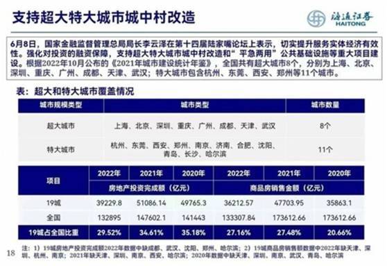 海通证券认为,从近三年大致统计情况看,超大特大城市(即以上19城市)过去3年房地产行业投资额占全国比重大致在30%-35%;销售金额占比大致在21%-27%。目前在核心城市集中布局国资央企城投平台直接受益。“我们认为如果城中村改造政策能够获得相关政策支持,对稳定核心城市投资和销售从而稳定全国大盘具有现实操作意义。”