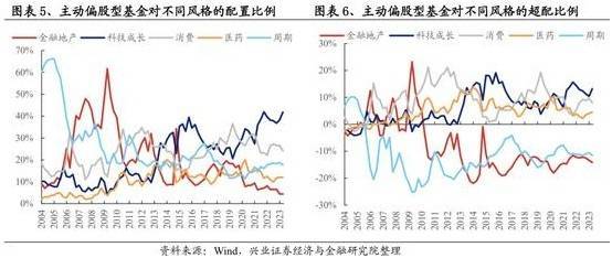 从机构持仓的比例来说,目前地产板块显然不是基金们的最爱。据兴业证券研报,2023Q2,主动偏股型基金对科技成长、消费、周期、医药和金融地产的配置比例分别41.78%、24.08%、17.73%、12.02%和4.38%;超配比例分别为13.20%、8.08%、-11.55%、4.54%和-14.14%。