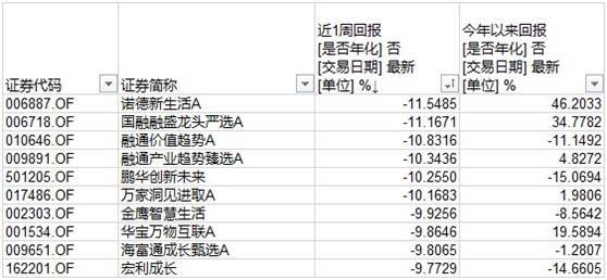 领跌的就热闹了,排在第一的是此前半年度(主动偏股基金)涨幅冠军诺德新生活A,7月以来连续调整,目前年内收益率从上半年的近75%掉到了46%(听着还是很凡尔赛);排第二的国融融盛龙头严选A,目前也仍有30%多的年内收益,应该说还是有韧性的。此外榜上的多只基金,目前年内表现都领先本周领涨的房地产相关基金。