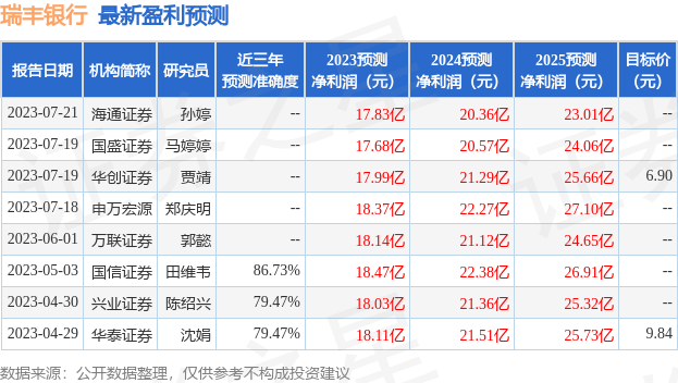 中泰证券股份有限公司戴志锋,邓美君近期对瑞丰银行进行研究并发布了研究报告《瑞丰银行1H23业绩快报:收入稳健,净利润增长16.8%;资产质量持续向好》,本报告对瑞丰银行给出增持评级,当前股价为5.19元。
