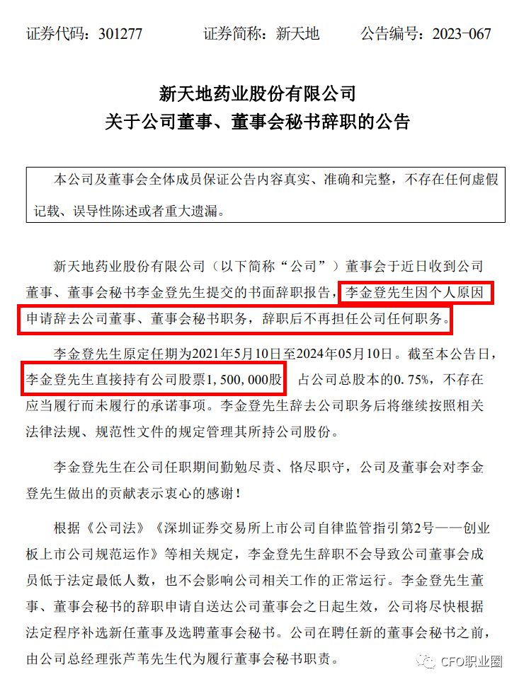2023年7月14日,新天地公告,公司董秘李金登先生因个人原因辞去公司董事、董秘职务,辞职后不再担任公司任何职务。