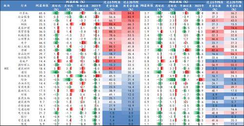 行业方面,本周(7.17-7.21)多数行业盈利预期小幅下调。周期板块中仅公用事业(0.8%)和环保(0.1%)盈利预期小幅上调;而煤炭(-3.8%)、电力设备(-1.6%)、基础化工(-1.3%)等行业盈利预期下调;传统消费板块中社会服务(5.8%)、商贸零售(0.6%)等行业的盈利预期上调幅度较大;成长板块中传媒(1.8%)、美容护理(0.7%)盈利预期上调;金融板块中房地产(437%)盈利预期上调幅度最大。