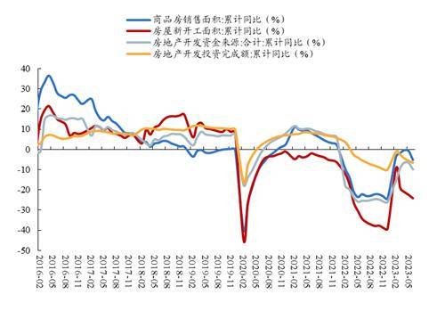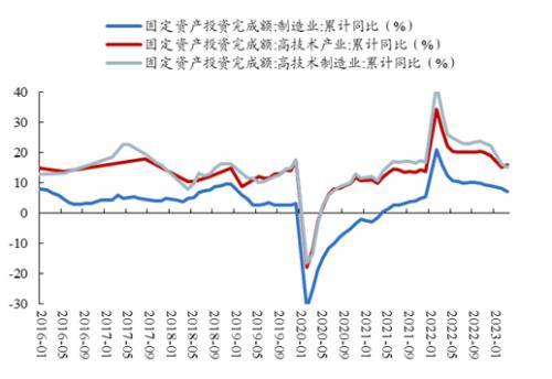 (2)基建与制造业为投资端亮点,新动能表现较优。从两年复合增速来看,2023年6月固定资产投资累计同比为4.9%,虽然自年初以来持续放缓,但结构上基建与制造业投资增速均具备韧性。其中,2023年6月基建投资累计同比为10%,增速连续两个月回升且年初以来持续处于9%以上;制造业投资累计同比为8.2%,尽管增速环比上月略微放缓了0.1pct,但整体表现仍具备韧性且下行斜率趋缓,呈现企稳特征。行业结构上来看,在政策的支撑下呈现出高技术产业优于整体的特征。从两年复合增速来看,2023年6月高技术产业、高技术制造业、高技术服务业的累计同比分别为16.3%、17.6%和13.2%。事实上,根据央行在7月发布会上指出,6月末制造业中长期贷款同比增长40.3%,其中高技术制造业中长期贷款同比增长41.5%。