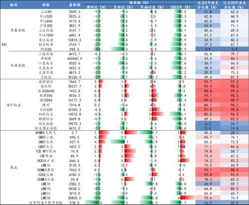 A股方面,本周(7.17-7.21)主要指数估值全线下跌,风险偏好回落。从PE(TTM)历史分位数来看,宽基指数创业板指、科创50处于较低历史分位数水平,其中创业板指的估值水平低于“1倍标准差下限”。近一周万得全A的 ERP水平有所上升,反映市场风险偏好回落。海外方面,本周海外市场主要指数估值水平涨跌互现,其中英国富时和道琼斯涨幅领先。