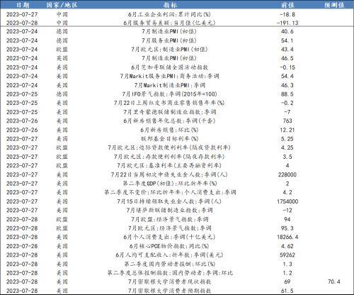 大宗商品方面,本周(7.17-7.21)大宗商品价格跌多涨少,天然气(7.3%)、小麦(5.3%)、玉米(4.5%)等大宗商品价格领涨,而波罗的海干散货指数(-10.3%)、镍(-3.8%)、铝(-2.8)、铜(-2.7%)、锌(-2.1%)等大宗商品价格领跌。领涨大宗商品的主要原因:(1)小麦、玉米等,近期俄罗斯退出了黑海粮食外运协议,并对黑海货轮发出航行警告,加剧了该地区的军事风险,降低乌克兰重启黑海出口粮食的希望;(2)天然气,美国天然气库存增幅不及市场预期,带动天然气价格上涨。领跌大宗商品的主要原因:(1)波罗的海干散货指数,主因较大型船需求疲弱;(2)镍、铝、铜等金属,市场预期美联储7月再次加息为大概率事件,叠加当前处于淡季,需求端支撑仍偏弱。