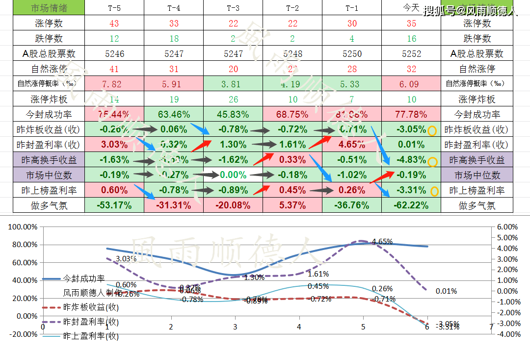 4、短线周期分析:从追板成功率看,今天的成功率正常,从个股方面看,炸板收益率很差,封板收益率正常偏低,高换手收益率很差,上榜收益率很差,图形同向往下有2交点,代表观点弱分歧,强势龙头股短线或走强。