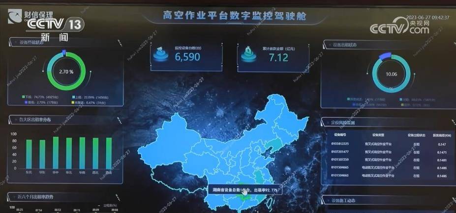 在湖南这家金融机构的大屏幕上,一个个小点组成了全国6500多台高空作业设备的实时运行数据图。动动手指,生产的每台设备的地理位置、开机状态和运行情况等数据都清晰可见。
