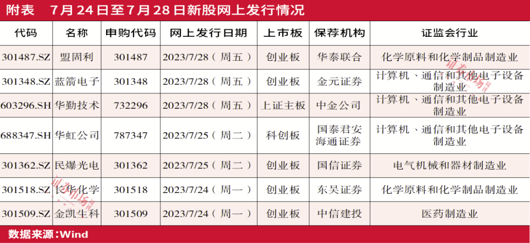下周(7月24日至7月28日),有7只新股拟网上发行,从板块来看,创业板共计5家,科创板及上证主板各一家。