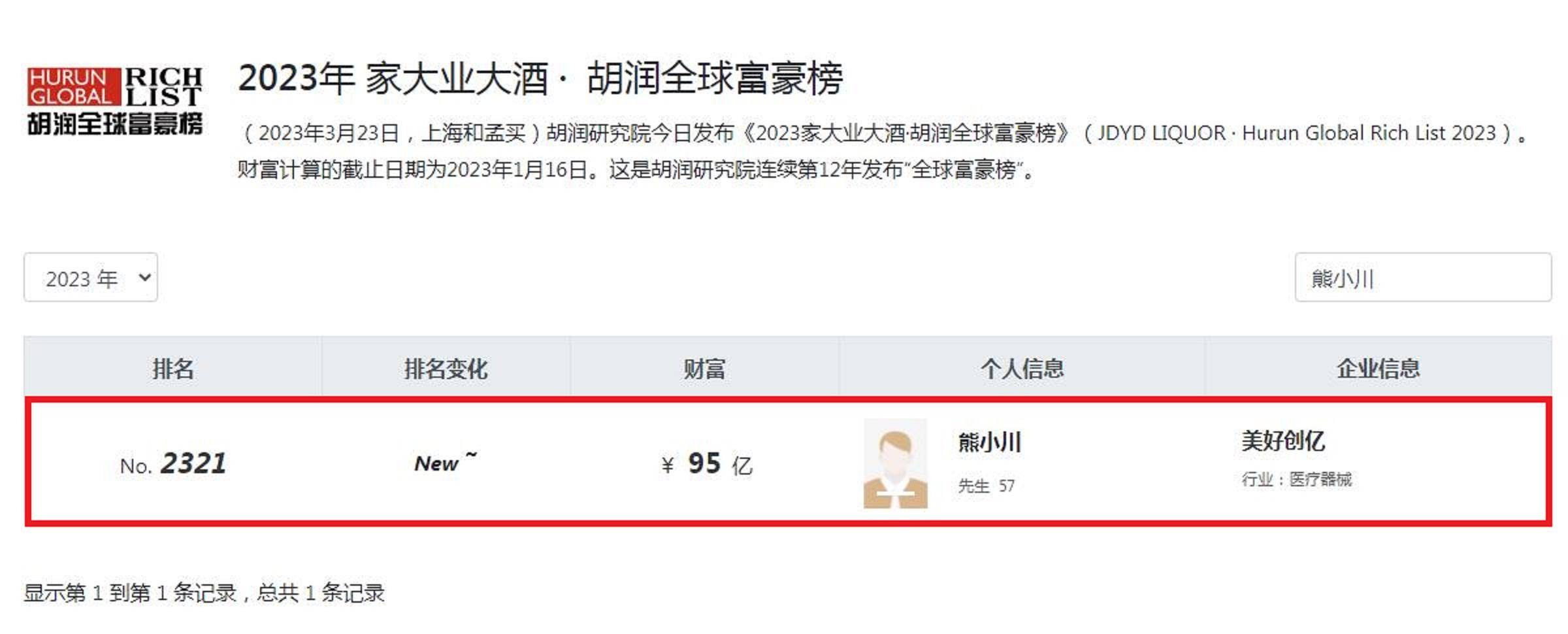 根据最新版《2023年胡润全球富豪榜》数据,熊小川以95亿元财富位列榜单第2321位,也是贵州黔南州本土唯一上榜的企业家,也被称为贵州“黔南首富”。