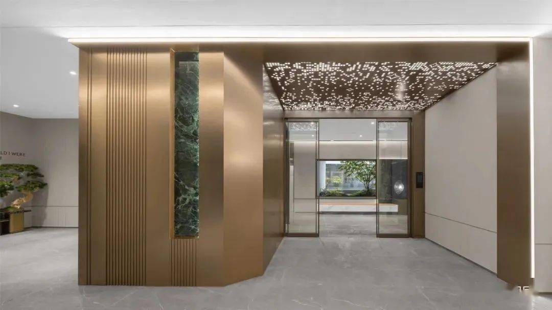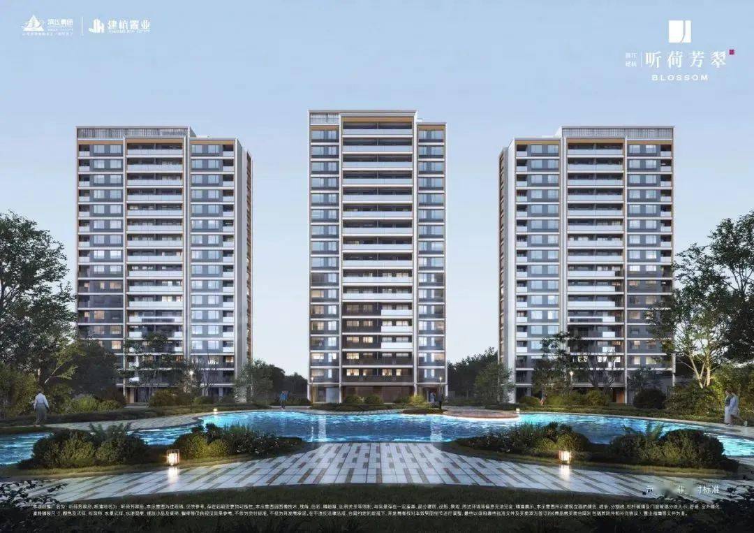 滨江的听荷芳翠府,也是精装均价2.26万/平,全部为15-17F的小高层,建筑南立面以玻璃和铝板为主打,檐板和阳台以金色金属线条勾勒,妥妥的高端立面标配。